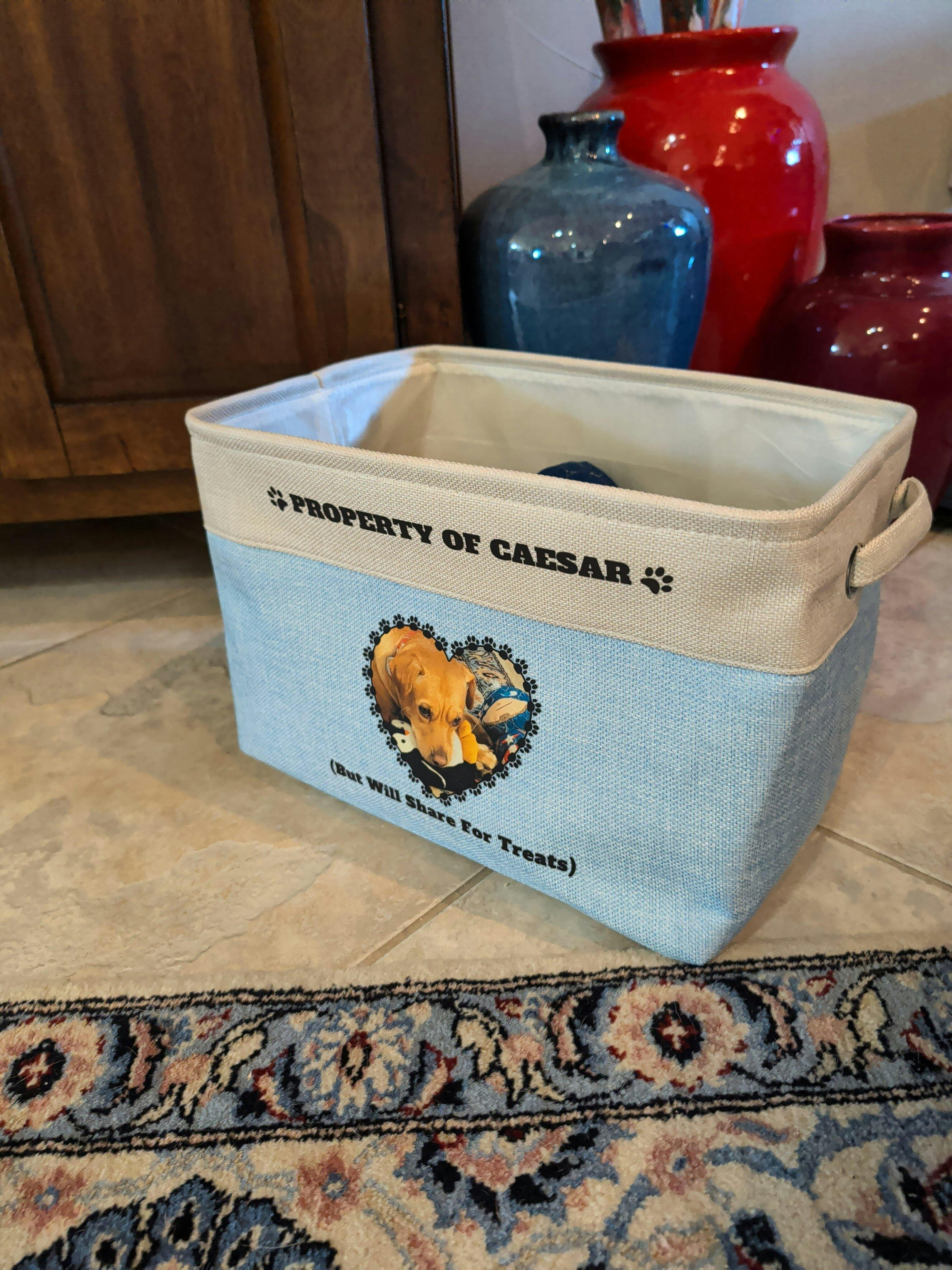 Very clever to have picture of the dog breed as well as pet’s name on the. Toy box.