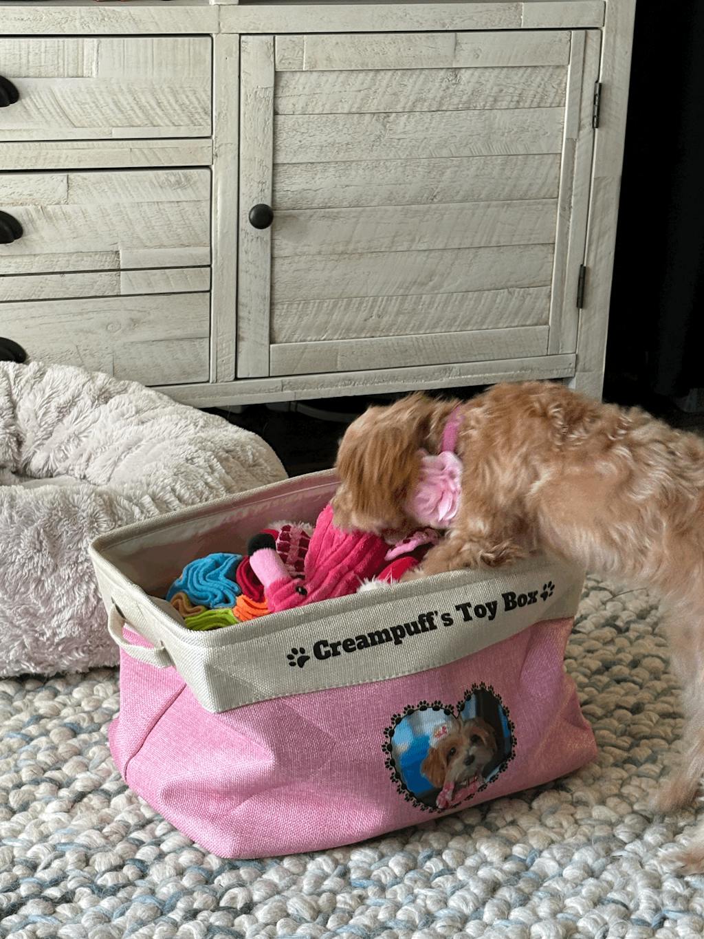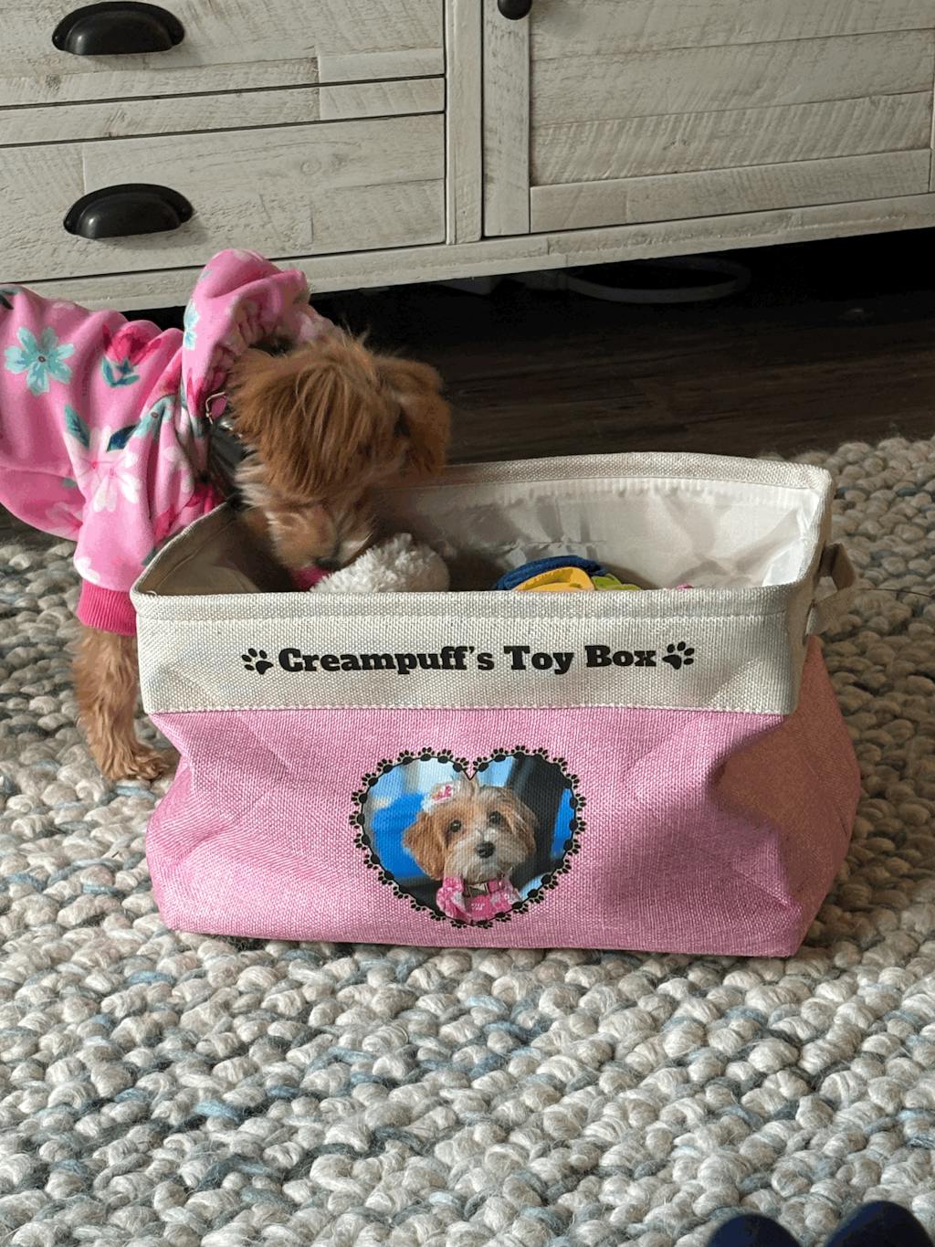 Introducing the Uniquely Customizable Dog Toy Box, a one-of-a-kind storage solution for dog lovers. This customizable toy box features a fun graphic of your favorite dog breed along with their name, making it a personalized and unique item.